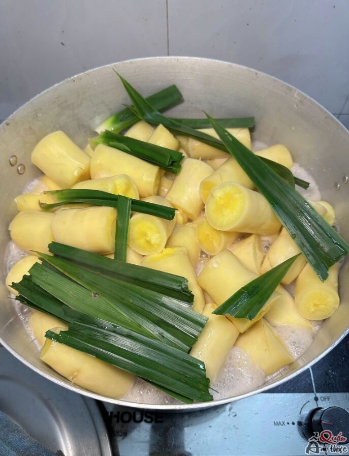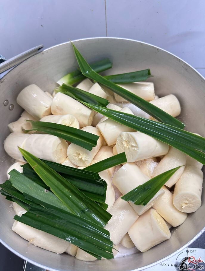 Tiếp theo, cho đường và muối vào, đảo nhẹ tay để khoai thấm vị. Đổ nước cốt dừa vào nồi, thêm lá dứa hoặc vani để tạo mùi thơm. Nấu thêm khoảng 10–15 phút, thỉnh thoảng đảo nhẹ để khoai không bị nát. Khi nước cốt dừa sánh lại, khoai mì dẻo mềm và có mùi thơm béo là hoàn thành.